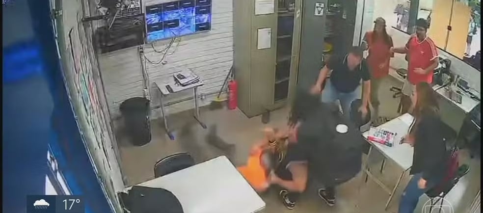 Imagens de câmeras de segurança mostram o homem segurando o professor pela gola da camisa e desferindo pelo menos nove golpes na cabeça dele, enquanto alunos tentavam intervir. Em meio ao tumulto, a própria filha do agressor tentou conter o pai e chegou a aplicar um “mata-leão” para impedir que as agressões continuassem.