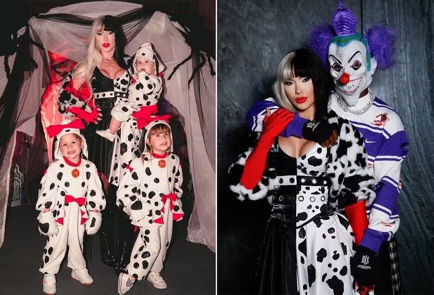 Para acompanhar o figurino, Virginia estava ao lado de seus filhos — Maria Alice (4 anos), Maria Flor (3 anos) e José Leonardo (1 ano) — que entraram no clima e se fantasiaram de dálmatas, em uma referência criativa e divertida ao universo de Cruella de Vil. Nas redes sociais, a família aparece em fotos trocando sorrisos e poses temáticas, reforçando o clima de descontração da noite.
